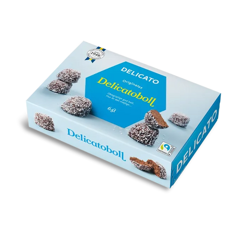 Delicatoboll is a beloved Swedish treat featuring soft, chocolatey oat balls with a hint of mocha, generously rolled in shredded coconut. This 6-pack (240g) is perfect for sharing during fika or enjoying as a sweet snack. Crafted without lactose and suitable for vegans, these indulgent bites are a delightful fusion of rich flavor and satisfying texture. Store at room temperature. Keeps better in the fridge and can be frozen!