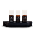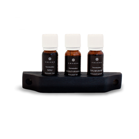 Enhance your sauna experience with this elegant Sauna Fragrances Set, featuring three 10ml bottles of Sisu, Pinewood, and Salmiac scents. Housed in a sleek black wooden wall rack, these fragrances are made with 100% essential oils and natural tar. Simply add 2-6 drops to a scoop of water, throw it on the hot stones, and immerse yourself in the calming, aromatic atmosphere of your sauna. A perfect blend of tradition and relaxation!