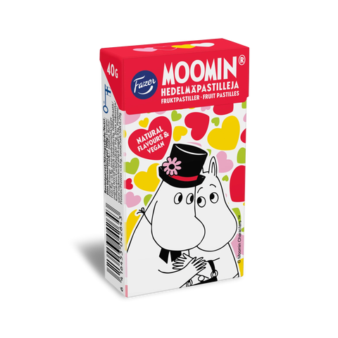 Heart-shaped Moomin fruit pastilles are as soft as Moominmamma's hugs! Enjoy four refreshing flavors: strawberry, forest berries, pear, and orange. Made with natural colors and flavors, these gelatine-free pastilles are vegan-friendly. Perfect for a treat or on-the-go adventures. (Contains wheat.)