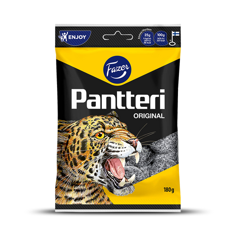 Pantteri is a salty-sweet menthol-flavoured salty liquorice, one of Fazer's all-time classic sweets. Tame your sweet tooth with Pantteri or share with your friends. (Contains wheat.)