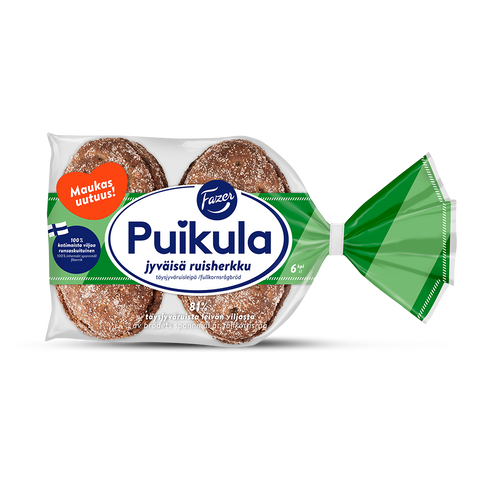 Fazer Puikula, one of the most popular breads in Finland, has that perfect rye flavour that Finns know and love. Jyväisä Ruisherkku (Grainy Rye Treat) is the new Puikula product. The true rye flavour comes from a long resting period and the rye starter used in the baking. This product is baked in Finland from 100% Finnish grain. It is high in fibre and contains no additives. Fazer Puikula comes in a package of 6 pieces. (Contains rye, wheat, and barley.)