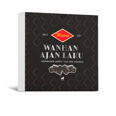 The familiar sweet and tasty, soft Wanhan Ajan Laku - Old Time Licorice in a new in a new stylish gift box of 290g. Halva's delicious licorice has been made in Finland since 1931. (Contains wheat.)