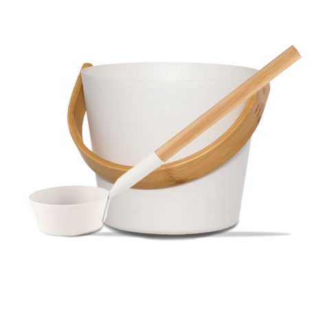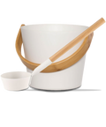 The set includes a sauna bucket and ladle. Timeless design combined with user-friendly shapes. The metal parts are colour-anodised aluminium, with handles of heat-treated bamboo. The dimensions for the bucket is 23 × 35 cm, and 43 cm for the ladle.