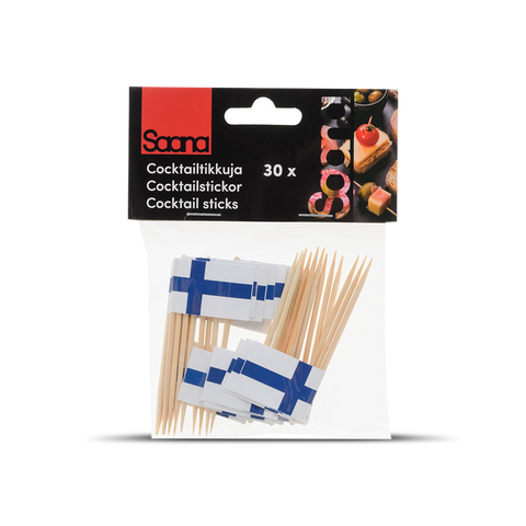 Finnish flag -Suomen lippu- wooden cocktail sticks can be used to serve meatballs, cheese and other small delicacies. Available in packages of thirty, the little flags are 2x3 cm and the length of the sticks is 6.5 cm.