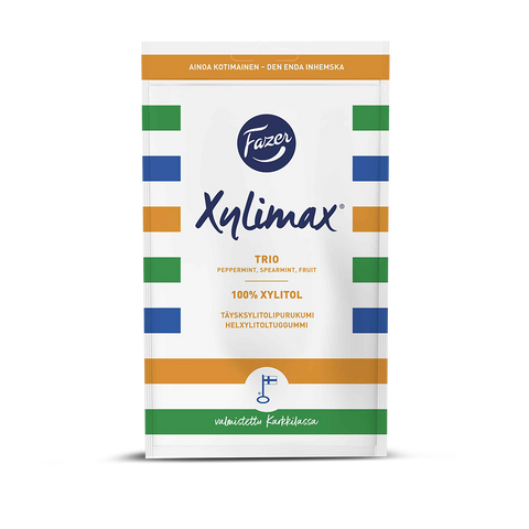 The popular Xylimax Trio bag of chewing gum contains three different flavours: peppermint, spearmint and fruit – everyone can find their favourite flavour in this bag! It is sweetened with xylitol only, which is proven to be good for your teeth. The Finnish Dental Association recommends xylitol. (Contains oat; may contain soy.)